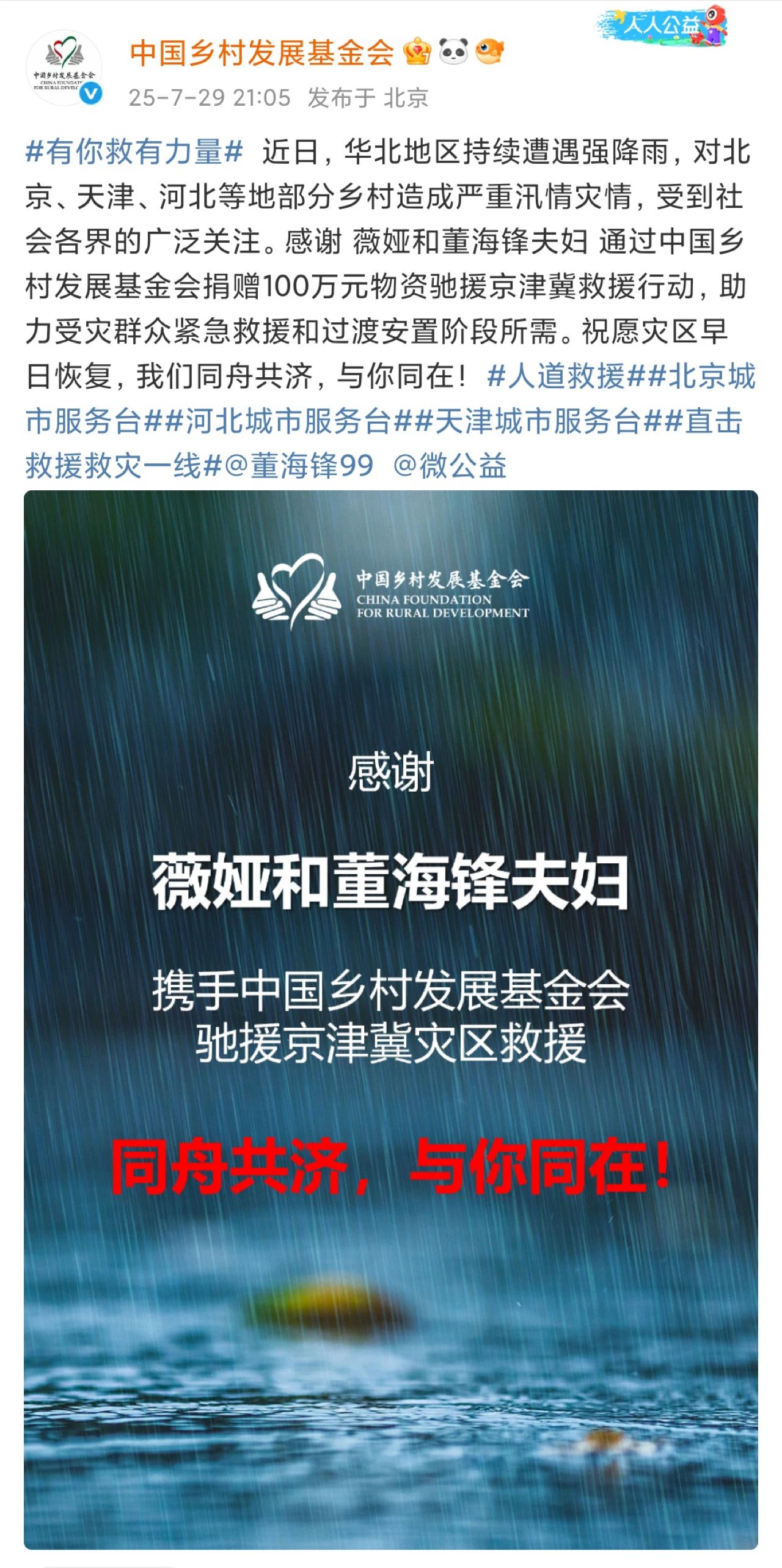 薇娅、董海锋夫妇捐赠100万元物资驰援京津冀灾区救援
